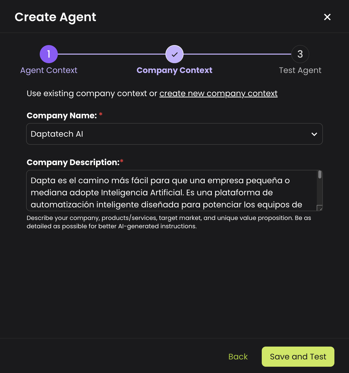 * **Generate Context with AI**: If you previously entered the URL, click "Generate Context" and our AI will automatically generate the description content from that website.