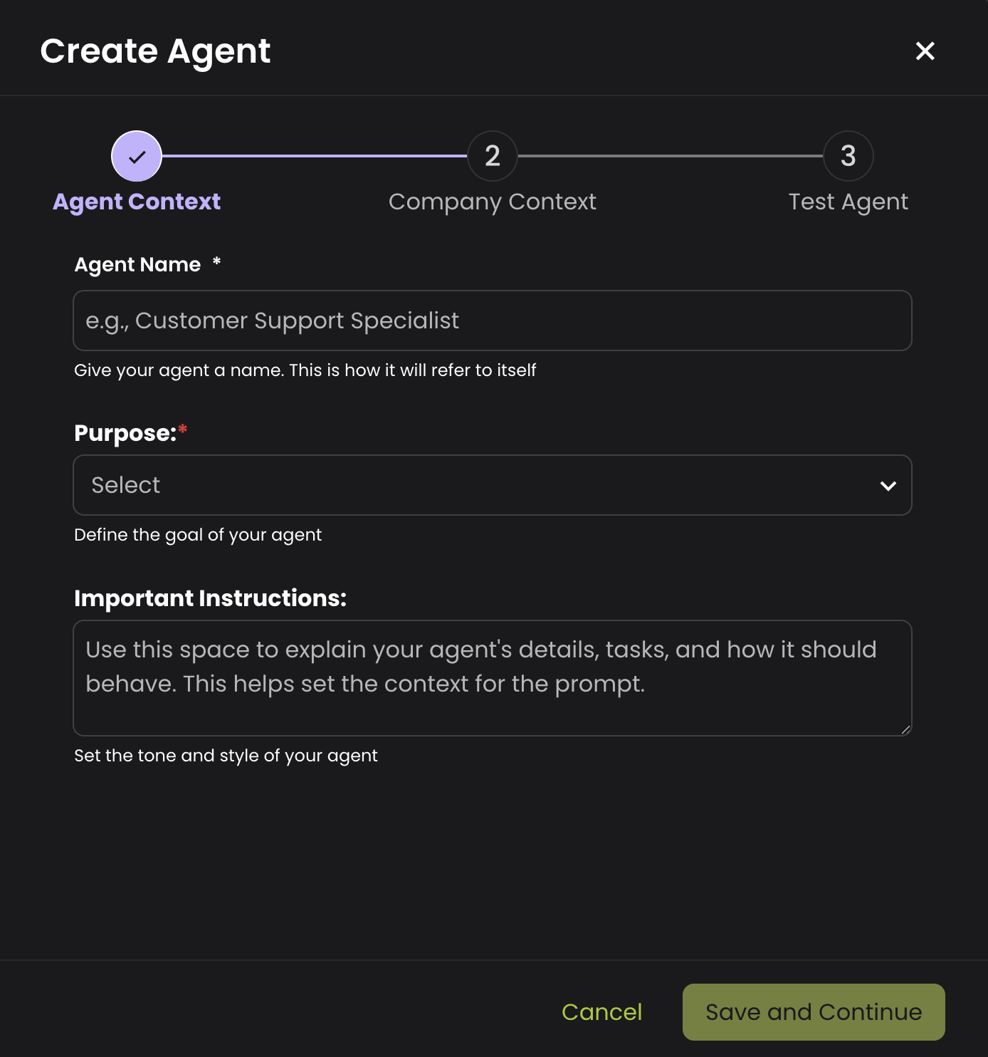 * **Purpose:** Choose the purpose of your agent; we have predefined use cases: