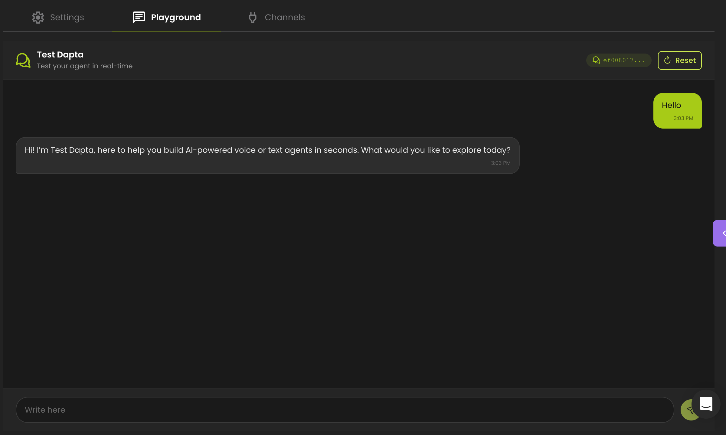 The Playground is a built-in testing environment inside each text agent.