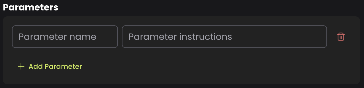 To add a parameter, simply click on β+ Add Parameterβ, enter the parameter name, and provide the respective instructions for that parameter.