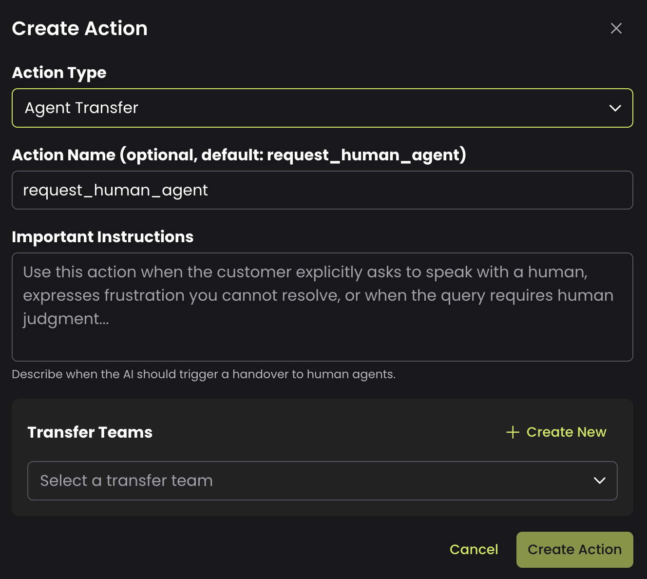 To add a new Action, go to "Settings, scroll down to the βAgent Actionsβ section, and click on β+ Add New Actionβ.