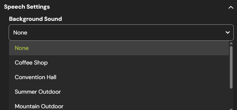 This setting allows you to add background sound to your agent, giving the call a bit more realism. You can also configure the volume of the ambient sound.