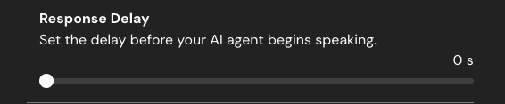 This setting can help make your AI agent feel more natural—especially in spoken interactions. Add a brief pause to simulate human-like reflection or reduce it for snappier conversations. Adjust as needed to match your preferred pace.\
