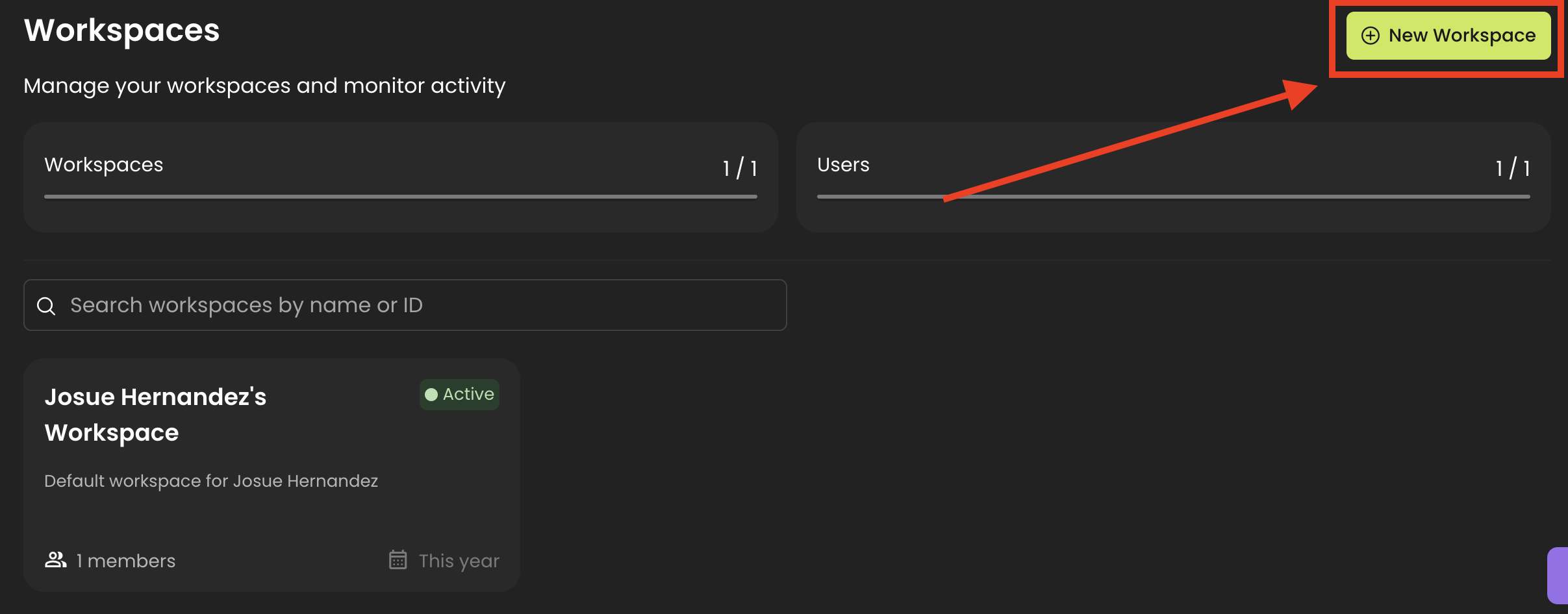 To create a new **Workspace**, go to the top-right corner of the page and click on **New Workspace**.