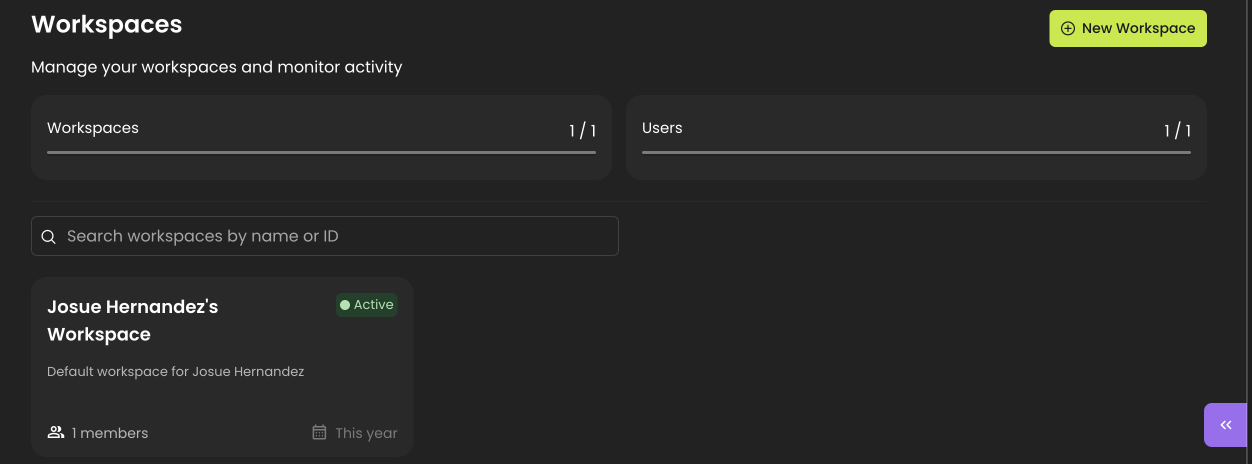 On the **Workspace** page, you’ll find a complete list of your existing workspaces (if any). This section also provides important insights, such as: