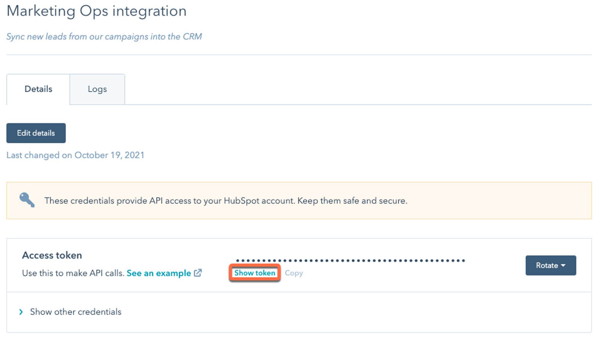 **Copy this key immediately**, as HubSpot will not display it again after this step.\