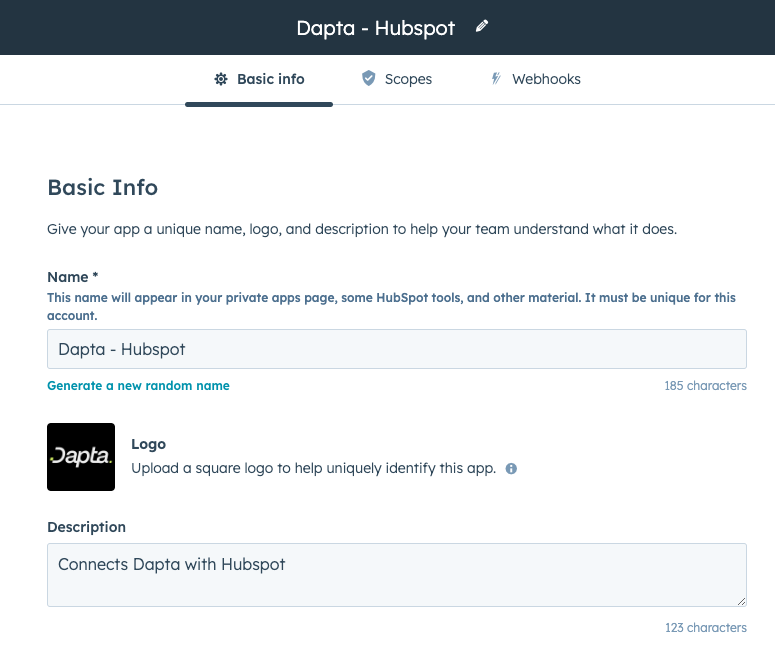 * (Optional) Add a **description** such as: *Allows Dapta to access HubSpot data for automation.*