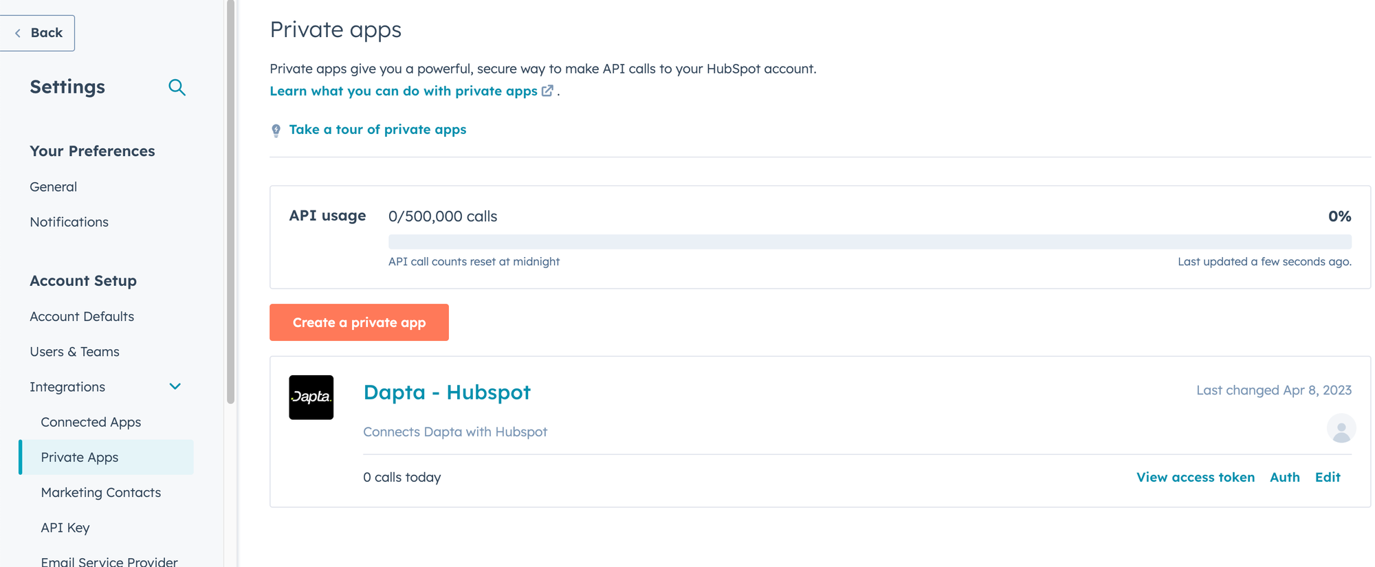 To integrate HubSpot with Dapta, you need to generate an API key by creating a **Private App** in HubSpot. Follow these steps: